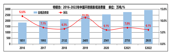從當(dāng)前的產(chǎn)業(yè)數(shù)據(jù)來(lái)預(yù)判,2021年中國(guó)不銹鋼表觀消費(fèi)量將增長(zhǎng)7.0%,達(dá)到2755萬(wàn)噸,2022年需求基本盤(pán)與彈性盤(pán)雙弱,增長(zhǎng)幅度回落至6.1%,預(yù)計(jì)中國(guó)不銹鋼表觀消費(fèi)量是2935萬(wàn)噸。